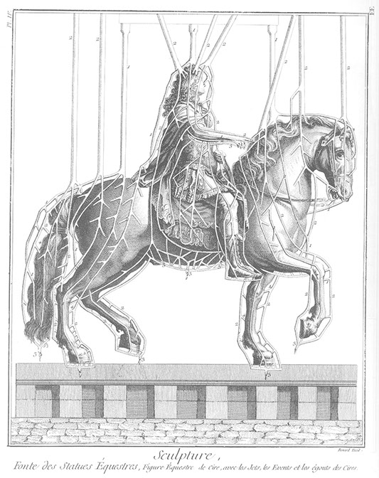 The Architecture of Error ‘Sculpture – Casting of Equestrian Statues’, from L’Encyclopédie of Diderot and d’Alembert, 1771, showing the air holes, irrigation and drainage conduits for lost wax casting.