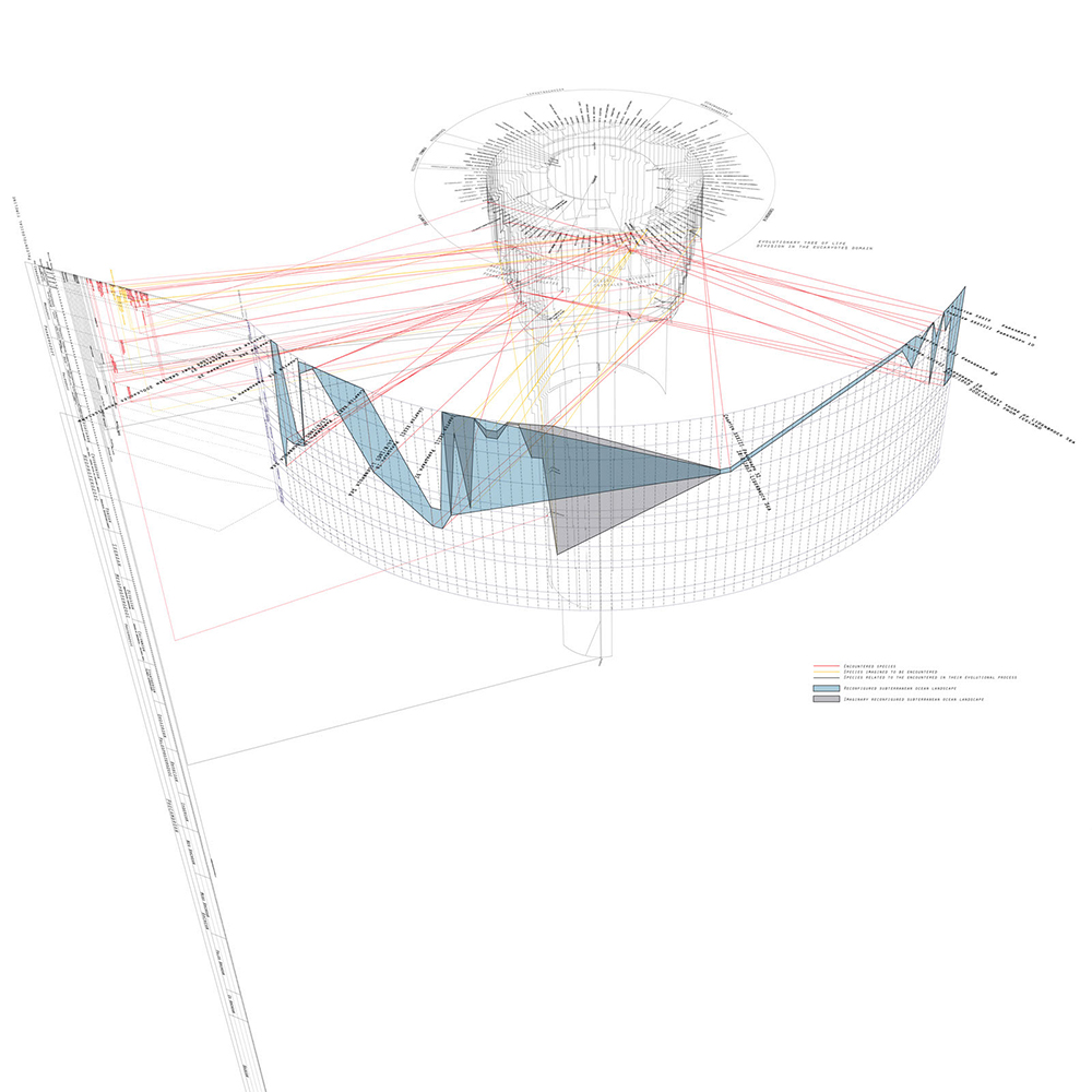 In Verne’s Journey to the Centre of the Earth, going down is literally going into the past, and space is read through the combined lens of geology and palaeontology. (Before carbon dating all palaeontologists had to be good geologists in order to date a find by its position in the strata.) In a central passage of the book, all geology disappears when the narrator crosses a dinosaur-filled subterranean ocean; in the absence of strata, Verne uses species identification to determine geological period and depth location. In the manner of Wittgenstein’s ‘Might I not use a table to measure a ruler?’ question, Ishikawa reconstructs the subterranean ocean landscape backwards from the species data, inverting the established relation between geology and palaeontology, using dinosaur-time to draw rock-time.
